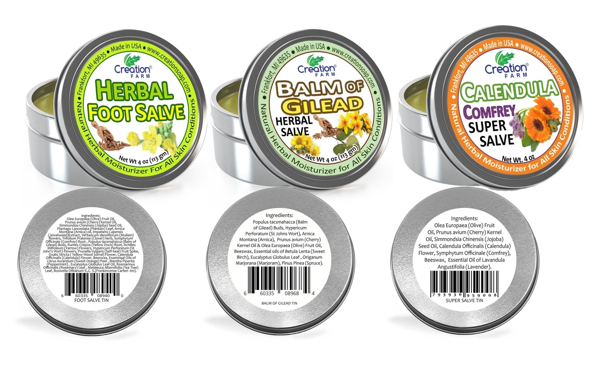 Creation Farm Herbal Salves 3 Pack 4 Oz Tins Includes Foot Salve Balm Of Gilead Calendula Comfrey Super Salve
